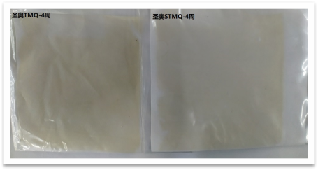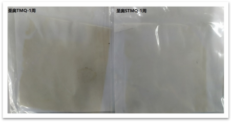 通过照片可以看出,在相同用量的情况下STMQ相较普通TMQ可以在一定程度上减少胶料的外观污染。考虑到STMQ减量使用的实际情况,会进一步改善胶料外观变色。