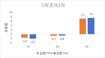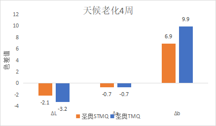 将使用各1.5份普通TMQ和STMQ硫化后的胶片进行室外天候老化实验,定时观察。并利用分光光度仪对其进行测色,测定的数据表示为L,a,b。L表示亮度,a和b各自表示色向。L的值越高代表越白、越明亮,而L的值越低则代表越黑、越暗;a的值越高代表越接近于红色,而a的值越低则代表越接近于绿色;b的值越高代表越接近于黄色,而b的值越低则代表接近于蓝色。图5、图6是硫化胶片在室外放置1周和4周后所对应塑料袋外观颜色的照片,。将硫化胶贴合并一同老化的塑料袋与未老化过的塑料袋进行颜色对比,得到Δa、Δb和ΔL值。图7、图8分别是放置1周和4周后的塑料袋颜色对比结果: