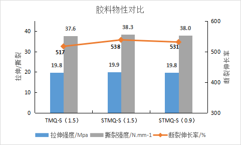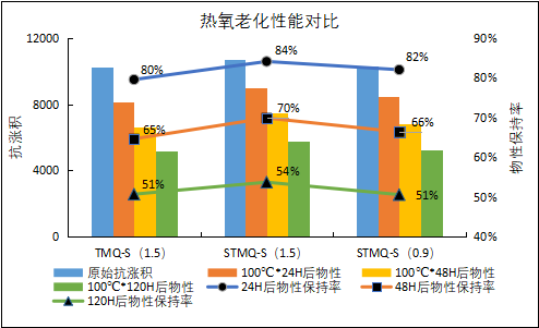 在100℃热氧老化箱进行不同时间热氧老化,综合来看,使用1.5份STMQ体现出优秀的抗热氧老化效果,抗张积保持率高。使用0.9份STMQ和1.5份普通TMQ抗热氧老化性能基本相当。