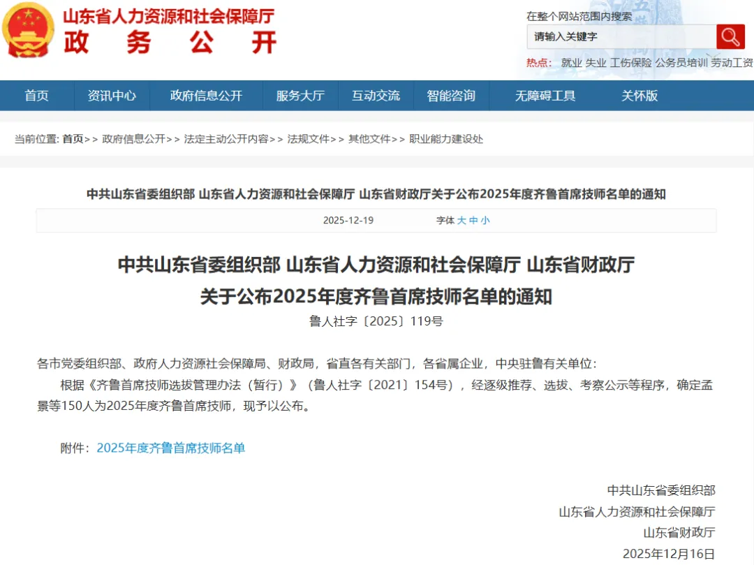 据了解,根据《齐鲁首席技师选拔管理办法(暂行)》(鲁人社字〔2021〕154号),经逐级推荐、选拔、考察公示等程序,最终确定150人为2025年度齐鲁首席技师。