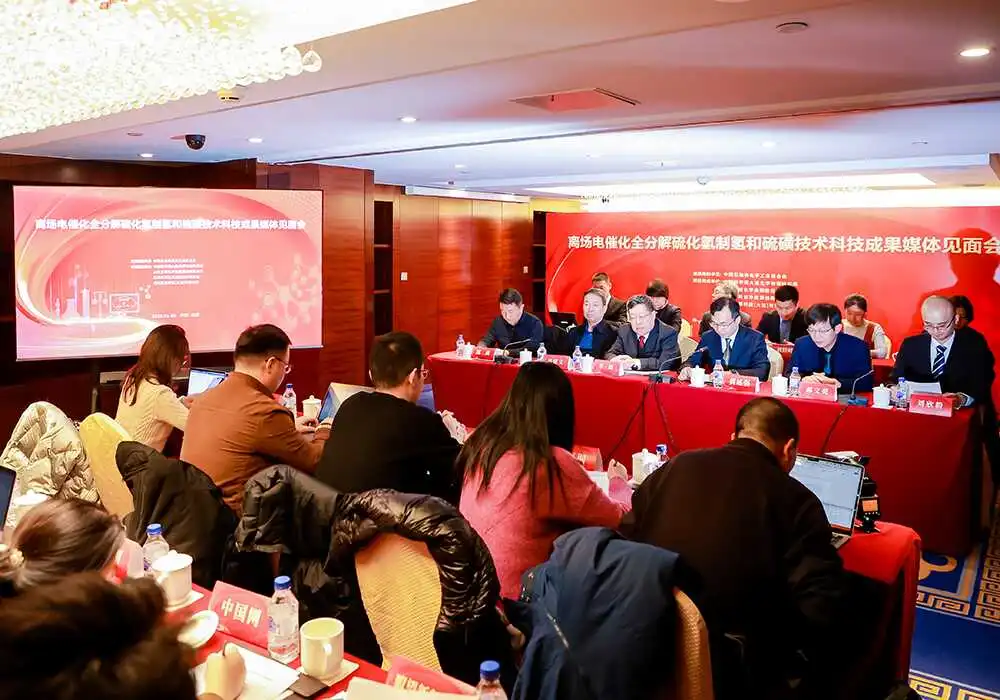 科技成果评价会后,我所举行了离场电催化全分解硫化氢制氢和硫磺技术科技成果媒体见面会,黄延强主持会议。新华社、中央电视台、中央人民广播电台、光明日报、经济日报、中国日报、科技日报、中国新闻社、中国科学报、人民网、光明网、中国网、瞭望新闻周刊、中国化工报、中国能源报、新京报、大公文汇报等媒体记者出席了媒体见面会。会上,我所王庆楠副研究员简要介绍了离场电催化全分解硫化氢制氢和硫磺技术情况,记者就感兴趣的问题与科技成果评价委员会专家、科研团队成员、企业代表等进行了交流。