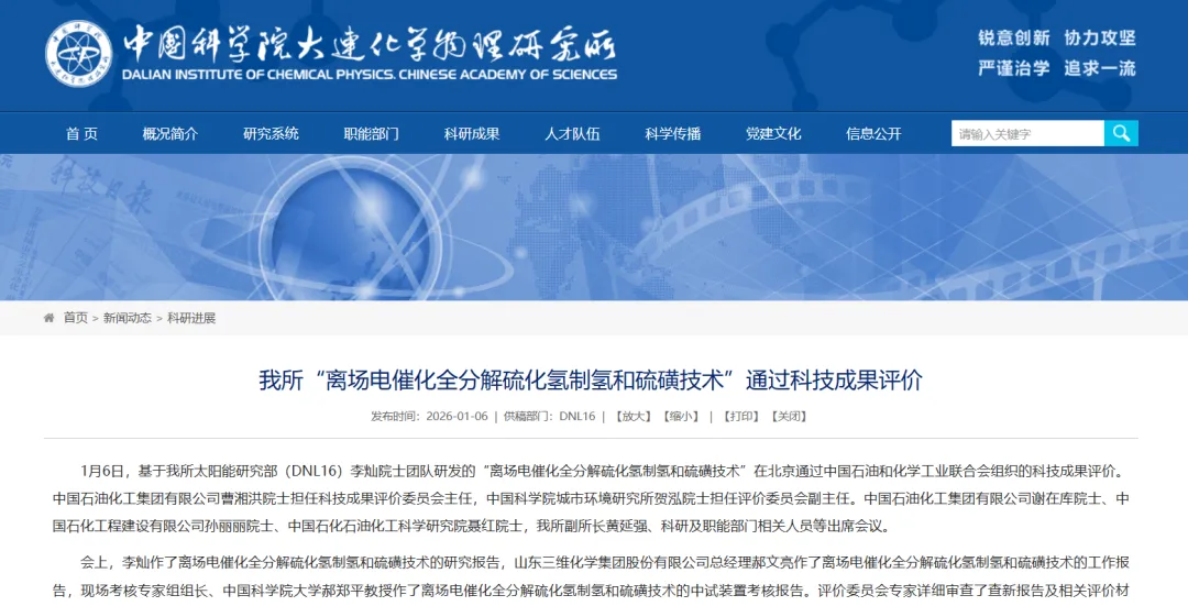 1月6日,基于我所太阳能研究部(DNL16)李灿院士团队研发的“离场电催化全分解硫化氢制氢和硫磺技术”在北京通过中国石油和化学工业联合会组织的科技成果评价。中国石油化工集团有限公司曹湘洪院士担任科技成果评价委员会主任,中国科学院城市环境研究所贺泓院士担任评价委员会副主任。中国石油化工集团有限公司谢在库院士、中国石化工程建设有限公司孙丽丽院士、中国石化石油化工科学研究院聂红院士,我所副所长黄延强、科研及职能部门相关人员等出席会议。