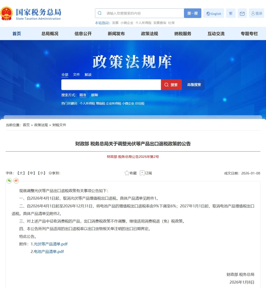 一、自2026年4月1日起,取消光伏等产品增值税出口退税。具体产品清单见附件1。