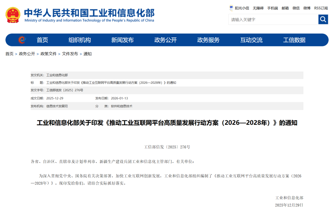 为深入贯彻党中央、国务院有关决策部署,加快工业互联网创新发展,工业和信息化部组织编制了《推动工业互联网平台高质量发展行动方案(2026—2028年)》。现印发给你们,请结合实际抓好落实。